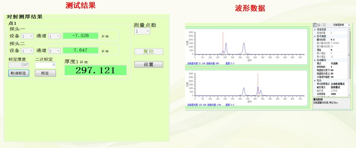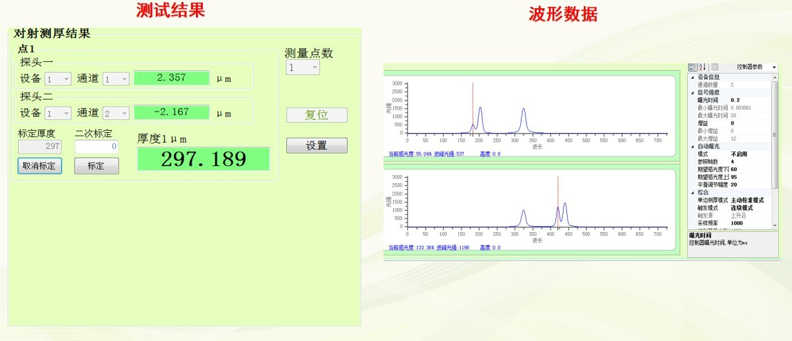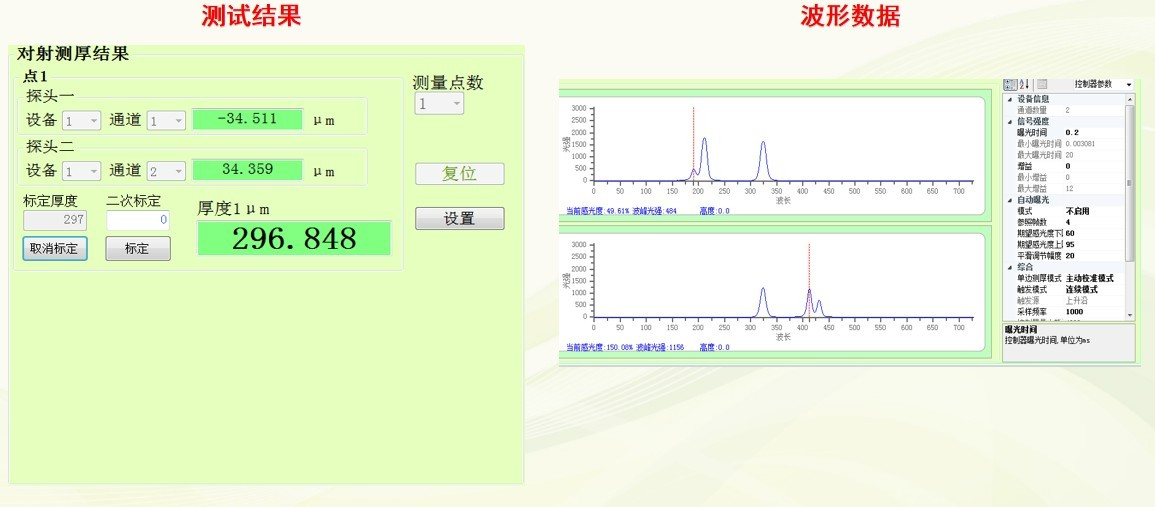 2、检测方式:将产品平置于对射平台上方,采用对射测厚模式,先将实际样品通过接触式测量出厚度值用来标定,再通过传感器软件测量样品其他指定位置的厚度。